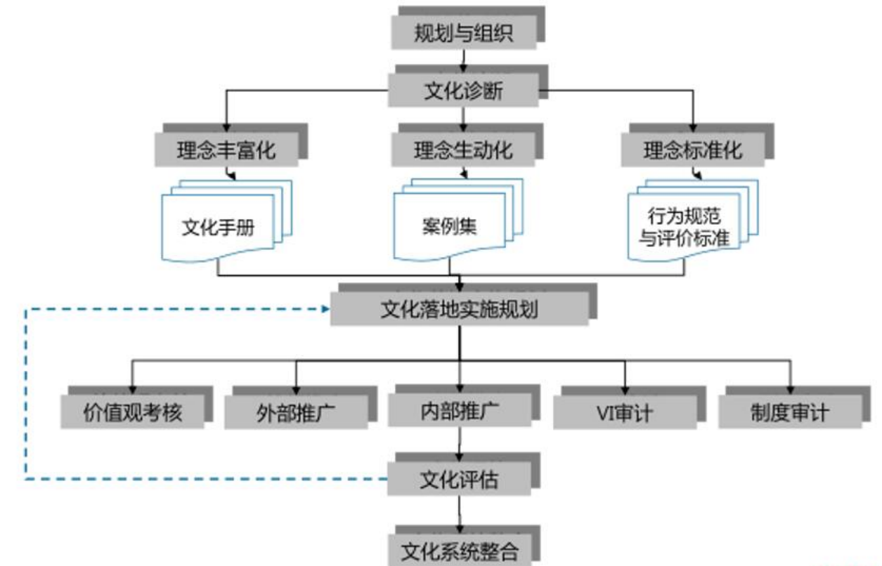 漢哲“企業(yè)文化咨詢工作地圖”,詳細(xì)描述了從文化落地實施規(guī)劃到文化定期評估與整合升華的全過程。