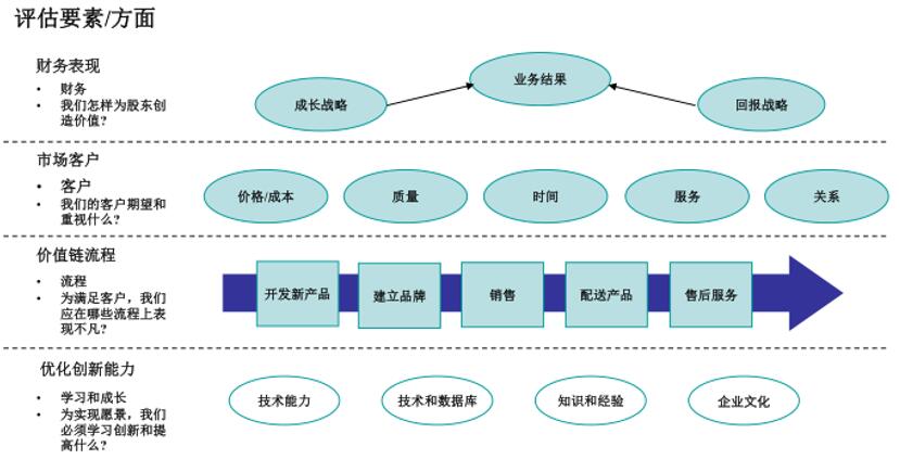 平衡計分卡是從財務(wù)、客戶、內(nèi)部運營、學(xué)習(xí)與成長四個角度,將組織的戰(zhàn)略落實為可操作的衡量指標(biāo)和目標(biāo)值的一種新型績效管理體系。設(shè)計平衡計分卡的目的就是要建立“實現(xiàn)戰(zhàn)略制導(dǎo)”的績效管理系統(tǒng),從而保證企業(yè)戰(zhàn)略得到有效的執(zhí)行。因此,人們通常稱平衡計分卡是加強企業(yè)戰(zhàn)略執(zhí)行力的最有效的戰(zhàn)略管理工具。