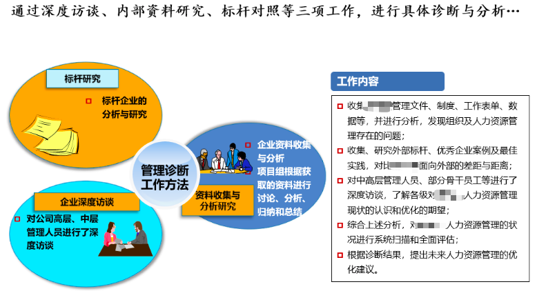 項(xiàng)目組通過內(nèi)部資料研究、企業(yè)深度訪談、外部標(biāo)桿對比等方式對公司管理現(xiàn)狀進(jìn)行全面診斷,發(fā)現(xiàn)問題并提出改進(jìn)的思路。