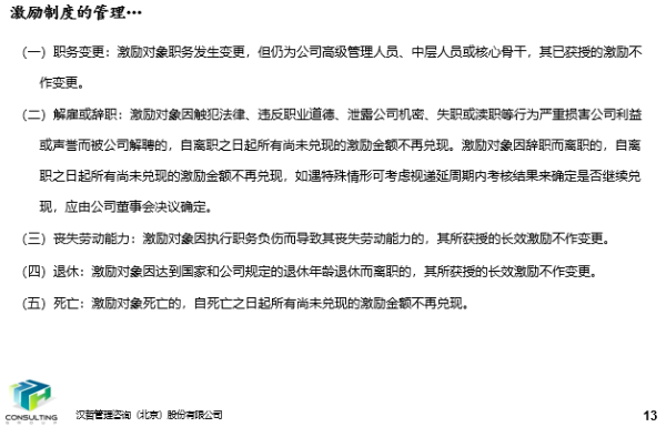 3、設(shè)計(jì)公司中長(zhǎng)期激勵(lì)體系。結(jié)合公司行業(yè)特性、具備資質(zhì)、業(yè)務(wù)特點(diǎn)及國(guó)家相關(guān)政策要求,甄選出適合公司的中長(zhǎng)期激勵(lì)方式,明確不同激勵(lì)方式所對(duì)應(yīng)的激勵(lì)對(duì)象,設(shè)計(jì)合理的中長(zhǎng)期激勵(lì)體系,制定配套的中長(zhǎng)期激勵(lì)管理制度,為公司新環(huán)境下戰(zhàn)略目標(biāo)的完成提供牽引力。