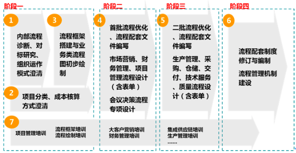 第二階段:主要為首批流程優(yōu)化、流程配套文件編寫,包含市場營銷、財務管理、項目管理流程設(shè)計(含表單)、會議決策流程專項設(shè)計。