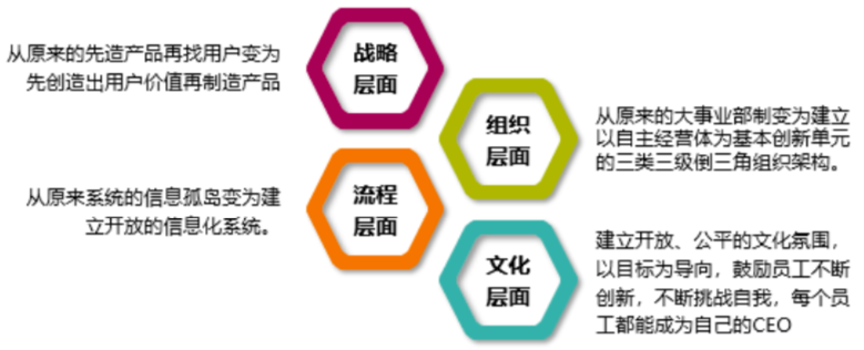 對外緊跟時代發(fā)展,以創(chuàng)造用戶需求為導(dǎo)向持續(xù)進(jìn)行管理創(chuàng)新;對內(nèi)以人為本,在企業(yè)內(nèi)部建立起一種公平高效的機(jī)制,為員工搭建一個“我的用戶我創(chuàng)造,我的增值我分享”的自我實現(xiàn)平臺。具體可分為四個層面。