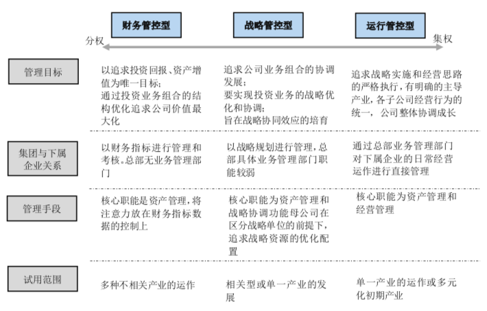 明確企業(yè)的戰(zhàn)略后,依據(jù)業(yè)務(wù)發(fā)展定位選在合適的管控模式,通常來(lái)說(shuō)集團(tuán)對(duì)下屬單位的管控模式依據(jù)集權(quán)程度分為財(cái)務(wù)管控型、戰(zhàn)略管控型和運(yùn)行管控型三種模式。而在實(shí)際操作中,根據(jù)業(yè)務(wù)發(fā)展的不同特點(diǎn),又衍生出戰(zhàn)略財(cái)務(wù)型管控和戰(zhàn)略運(yùn)行型管控兩種模式。