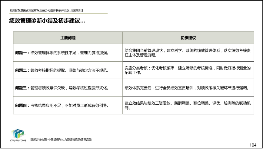 項(xiàng)目啟動后,項(xiàng)目組通過深度訪談、問卷調(diào)查、資料收集、外部分析四個方面對集團(tuán)現(xiàn)狀進(jìn)行全面診斷,發(fā)現(xiàn)目前存在的問題并提出四大核心舉措,明確改進(jìn)思路。