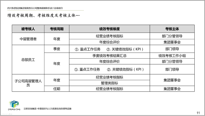 1、優(yōu)化集團(tuán)和子公司經(jīng)營業(yè)績考核辦法。根據(jù)集團(tuán)戰(zhàn)略目標(biāo)和子公司的功能定位、業(yè)務(wù)特點(diǎn),集團(tuán)總部實(shí)行年度考核,所屬子公司實(shí)行年度考核與任期考核相結(jié)合的方式,遵循戰(zhàn)略導(dǎo)向、團(tuán)隊(duì)導(dǎo)向、客觀公正、分類考核的原則,制定各部門考核指標(biāo)、考核程序、考核計(jì)分辦法,形成經(jīng)營業(yè)績考核辦法,提高激勵作用,為實(shí)現(xiàn)集團(tuán)戰(zhàn)略目標(biāo)夯實(shí)基礎(chǔ)。