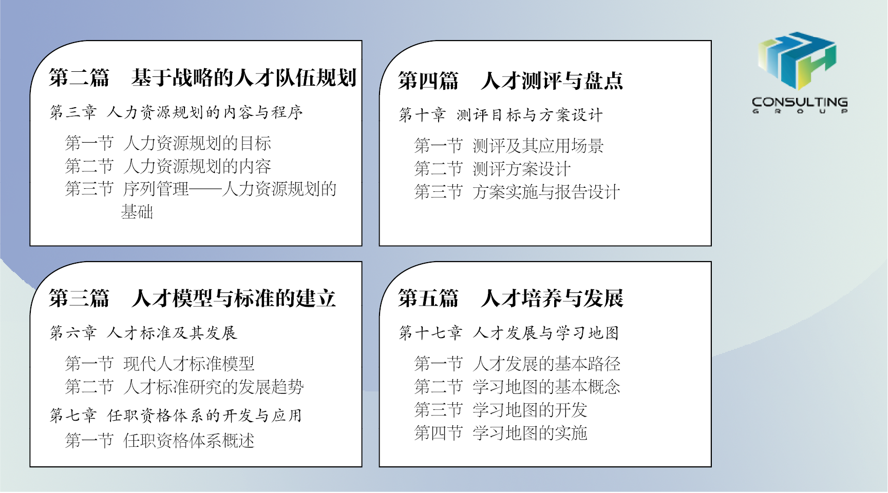 - 要對(duì)素質(zhì)模型、任職資格、領(lǐng)導(dǎo)力模型等不同類型能力建設(shè)工具的起源、特點(diǎn)、操作流程、技術(shù)要求等描述清楚,要能夠讓企業(yè)人才工作者可以對(duì)著書本“臨摹”,至少能夠了解不同工具的特點(diǎn)與應(yīng)用場景。