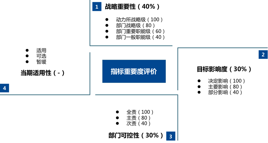 部門關(guān)鍵業(yè)績指標(biāo)和重點工作任務(wù)指標(biāo)應(yīng)反映部門主要的工作業(yè)績和職責(zé)履行情況,原則上以8項左右為宜,最多不超過12項。通過指標(biāo)關(guān)系圖和指標(biāo)評價模型對指標(biāo)庫中各部門的考核指標(biāo)進行篩選,選取當(dāng)期納入考核的核心指標(biāo)。