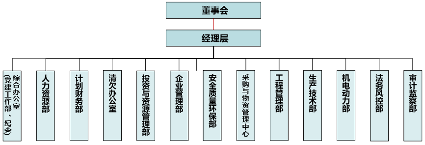 目前員工4000人以上,全資分子公司20家,其中煤礦3個(gè)。集團(tuán)總部原組織架構(gòu)如下: