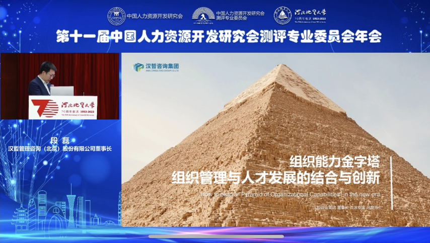 作為專(zhuān)委會(huì)常務(wù)理事,漢哲咨詢首席專(zhuān)家段磊博士受邀參加年會(huì)并于21日下午在大會(huì)發(fā)表了題為《組織能力金字塔-組織管理與人才發(fā)展的結(jié)合與創(chuàng)新》的主題發(fā)言,系統(tǒng)介紹了漢哲自主研發(fā)的“組織能力金字塔”模型及其應(yīng)用實(shí)踐,得到了與會(huì)專(zhuān)家的一致好評(píng)。10月22日,段磊博士參加了《人才發(fā)展現(xiàn)代化賦能高質(zhì)量發(fā)展》分論壇活動(dòng),并作為嘉賓為參加研討的各位報(bào)告人進(jìn)行了專(zhuān)業(yè)的點(diǎn)評(píng)。