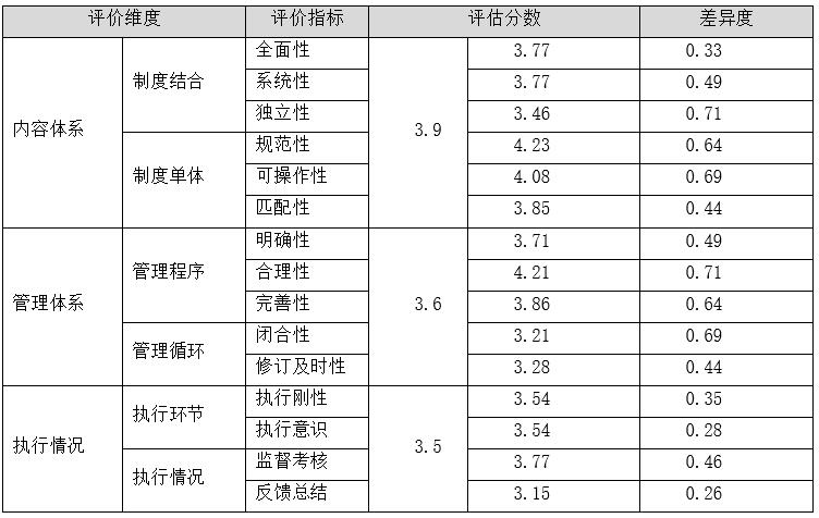 單項(xiàng)指標(biāo)得分總和的平均數(shù)作為最終得分。分值越高,說(shuō)明對(duì)現(xiàn)有制度體系的總體認(rèn)可度越高。單項(xiàng)指標(biāo)的分值方差代表評(píng)價(jià)差異度,差異度越高,表明內(nèi)部對(duì)同一指標(biāo)的意見差異越大。超過(guò)一定偏差,需要重新進(jìn)行打分。