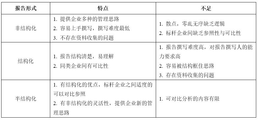 標(biāo)桿企業(yè)研究報(bào)告按照結(jié)構(gòu)形式可以分為非結(jié)構(gòu)化(案例研究)、結(jié)構(gòu)化、半結(jié)構(gòu)化三種類型,每種類型的報(bào)告均有自己的特點(diǎn)與適用范圍,實(shí)施標(biāo)桿企業(yè)研究的企業(yè),可以結(jié)合本單位的實(shí)際需要撰寫,各種類型報(bào)告的比較如下表所示。